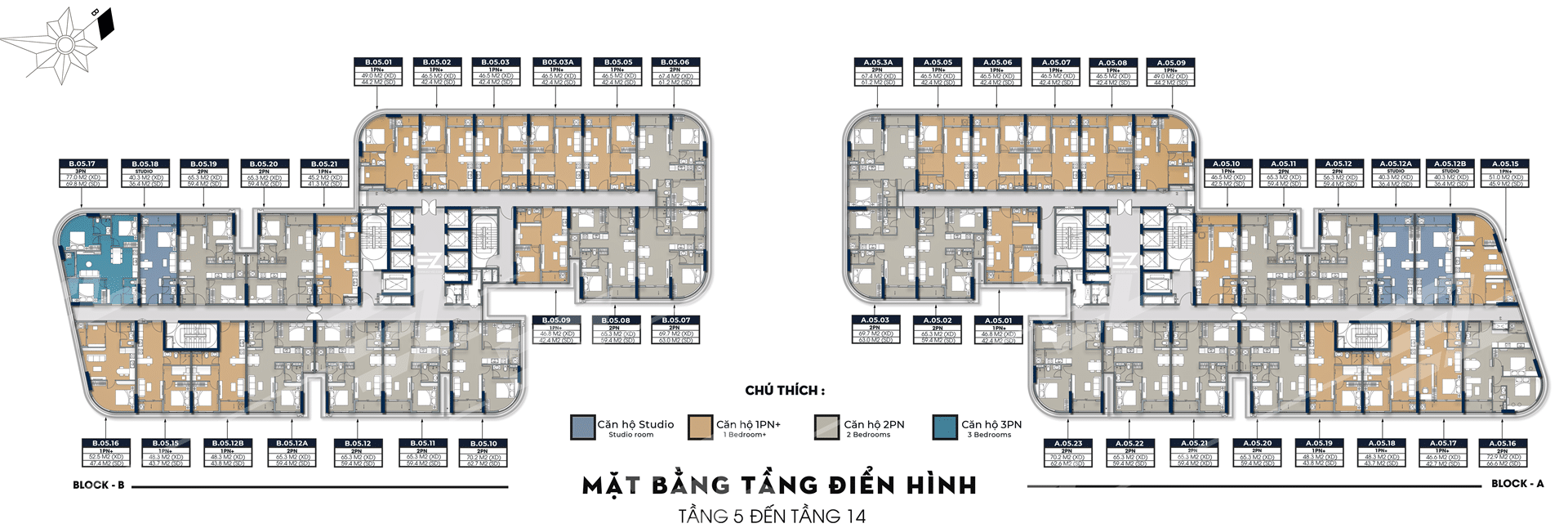 - Tầng 5 – 20 & 21 – 40: Căn hộ 1 – 3 phòng ngủ