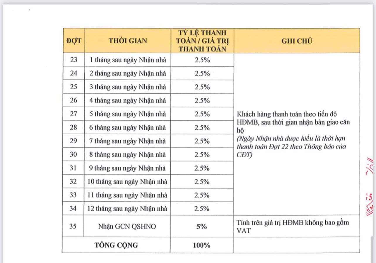 Lịch thanh toán ân hạn gốc lãi 24 tháng Phú Đông Sky One mới nhất tháng 11/2025: