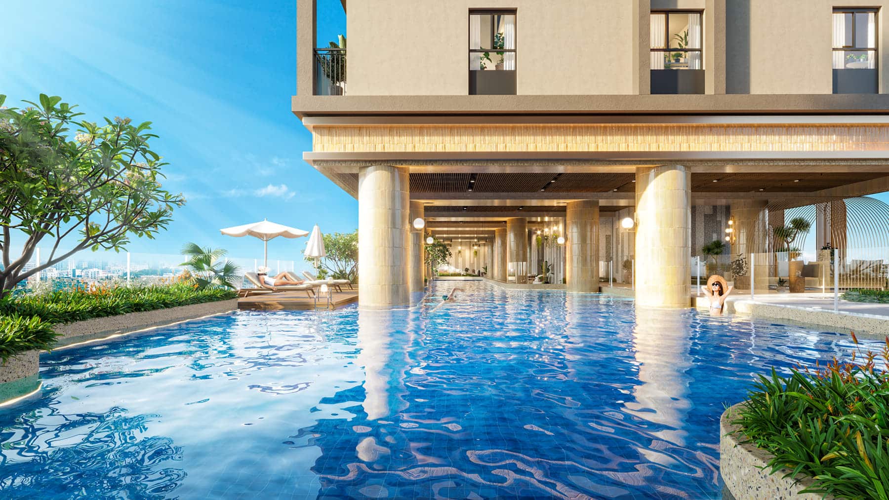 - Hồ bơi tràn bờ nước ấm trên không: Tận hưởng cảm giác thư giãn tuyệt vời trong làn nước ấm áp, ngắm nhìn toàn cảnh thành phố lung linh.