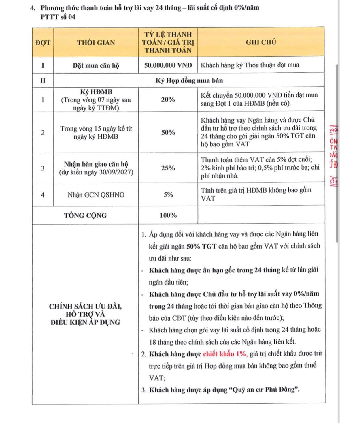 - Được chủ đầu tư hỗ trợ 100% lãi vay trong 24 tháng hoặc tới thời gian bàn giao căn hộ theo TB bàn giao của CĐT (tuỳ theo điều kiện nào đến trước)