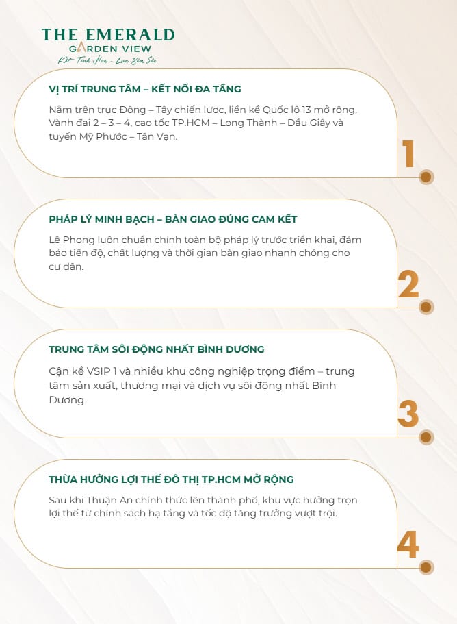 Giá trị vị trí của The Emerald Garden View còn được gia tăng khi nằm gần các khu công nghiệp quy mô lớn như VSIP 1 và Việt Hương – nơi tập trung đông đảo chuyên gia, kỹ sư trong và ngoài nước sinh sống và làm việc. Điều này hình thành nên cộng đồng cư dân văn minh, năng động và có nhu cầu an cư ổn định. Bên cạnh đó, sự hiện diện của các tiện ích trọng điểm như Aeon Mall Bình Dương, Lotte Mart, Bệnh viện Quốc tế Hạnh Phúc và khu Becamex tiếp tục khẳng định sức hút và tiềm năng an cư – đầu tư bền vững của khu vực.