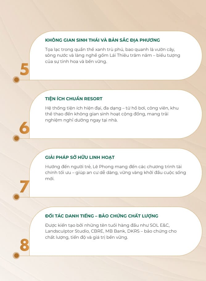 Các khu nhà ở được sắp xếp đồng bộ, kết nối linh hoạt với hệ thống giao thông nội khu và chuỗi tiện ích trung tâm. Mảng xanh, công viên và lối dạo bộ được phân bổ xuyên suốt dự án, tạo nên môi trường sống trong lành, gần gũi thiên nhiên.