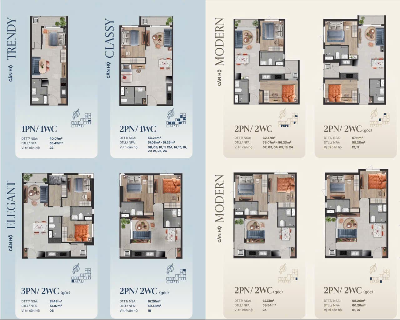 - Studio – 1PN+: Diện tích từ 40m² – 56m², phù hợp với người độc thân, các cặp đôi trẻ hoặc nhà đầu tư tìm kiếm giá trị bền vững.